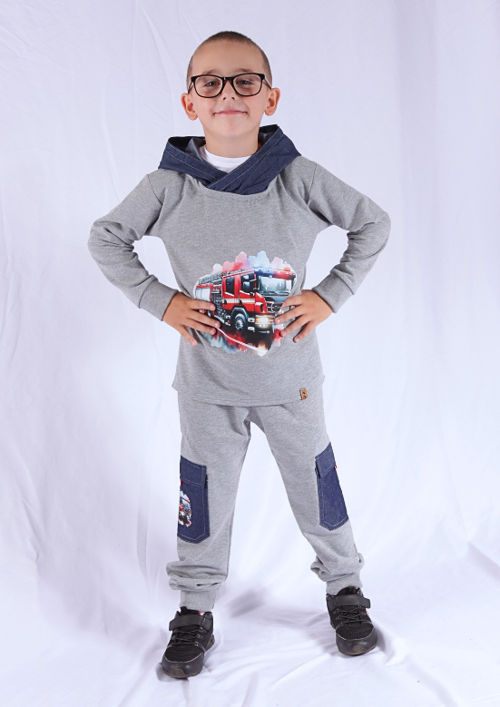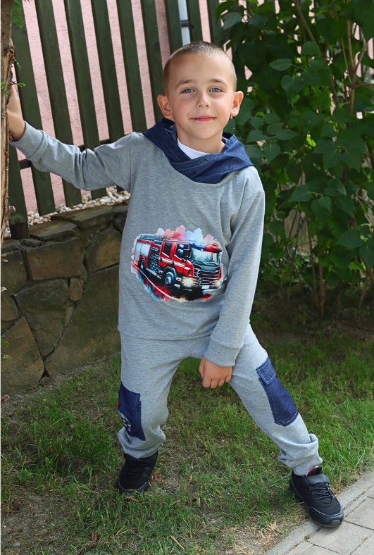 Chlapčenský setík pozostáva zo slimkových teplákov s vreckami a mikiny s kapucňou. Všetko je z tenšej teplákoviny s elastanom. Detaily ako sú vrecká a kapucňa sú zhotované s veľmi jemnej riflovinky.Hasiči môžu vyraziť!